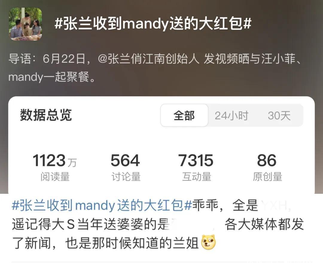 不光拿下了汪小菲,就连婆婆张兰也被拿下。就在最近,张兰本东谈主在视频账号中晒出合家欢的物料,亲热称号“儿媳妇”,还昂然收下马筱梅递上的大红包。之后,张兰方面还有益在平台上营销了一个话题,况兼,热度不小。